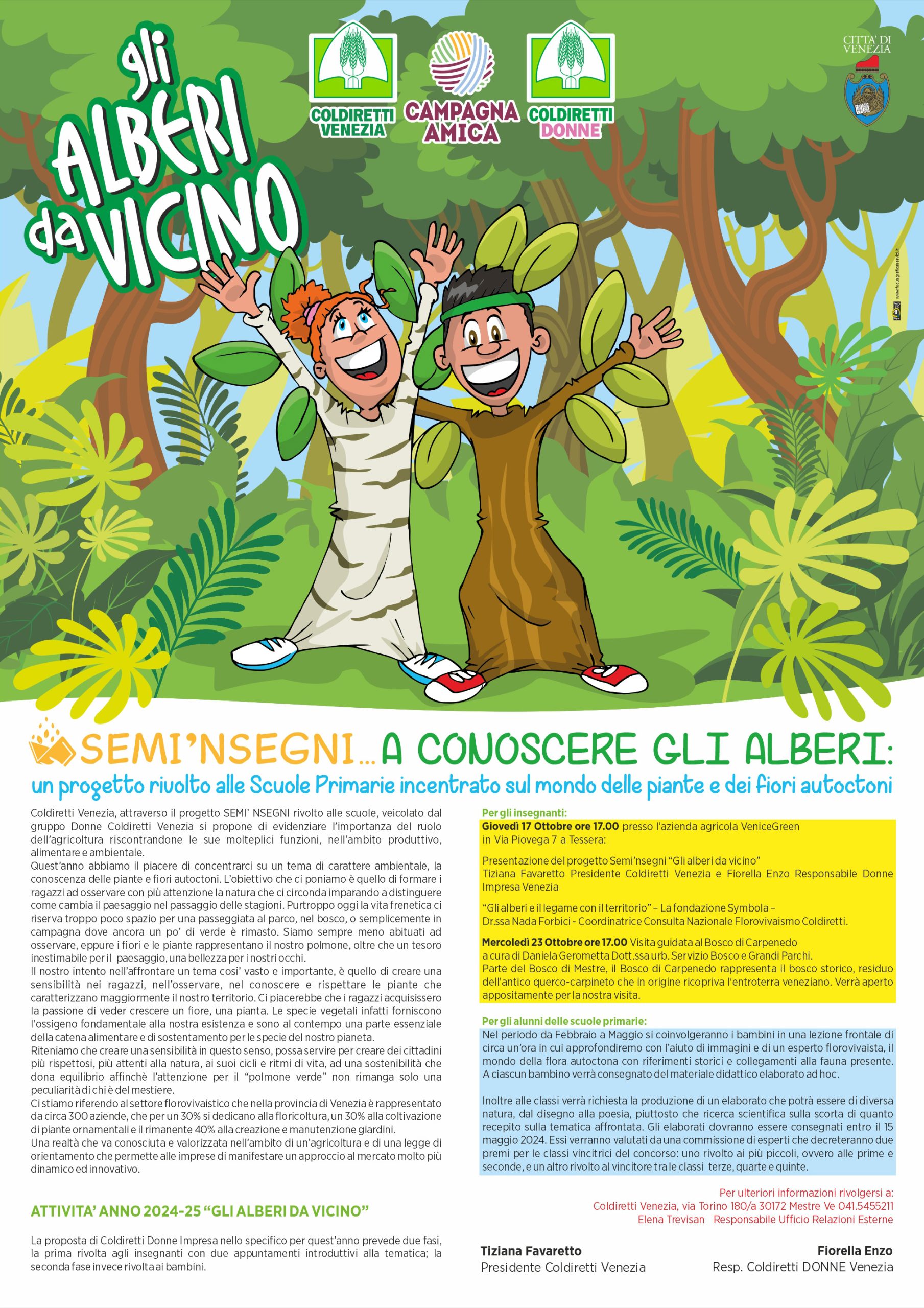 Il progetto, che ha il Patrocinio del Comune di Venezia, veicolato da Donne Coldiretti si propone di creare una sensibilità nei ragazzi, nell’osservare, nel conoscere e rispettare le piante che caratterizzano maggiormente il nostro territorio, imparando a cogliere anche i cambiamenti del paesaggio nelle quattro stagioni.