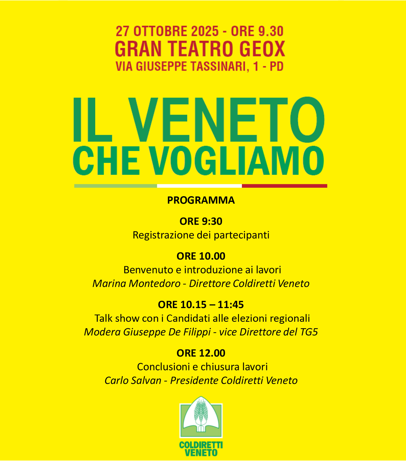 DOMANI, 27 ottobre 2025 alle ore 10.00 al Palageox di Padova gli agricoltori di Coldiretti Veneto incontreranno i candidati presentando ufficialmente “Il Veneto che vogliamo”, documento programmatico redatto per la XII Legislatura con il quale l’organizzazione agricola si rivolge al prossimo Governatore del Veneto.