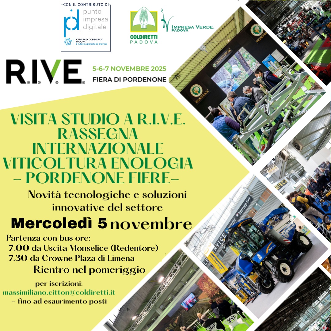 Coldiretti Impresa Verde Padova organizza una visita studio, in giornata, a Pordenone Fiere in occasione di “RIVE – Rassegna Internazionale Viticoltura Enologia- Innovazione in Viticoltura”, il prossimo 5 novembre, nell’ambito del progetto Pid Punto Impresa Digitale della Camera di Commercio di Padova. Partenza in bus da Monselice (ore 7) e Limena Crowne Plaza (ore 7.30). Per adesioni, fino ad esaurimento posti, inviare una mail a massimiliano.citton@coldiretti.it.