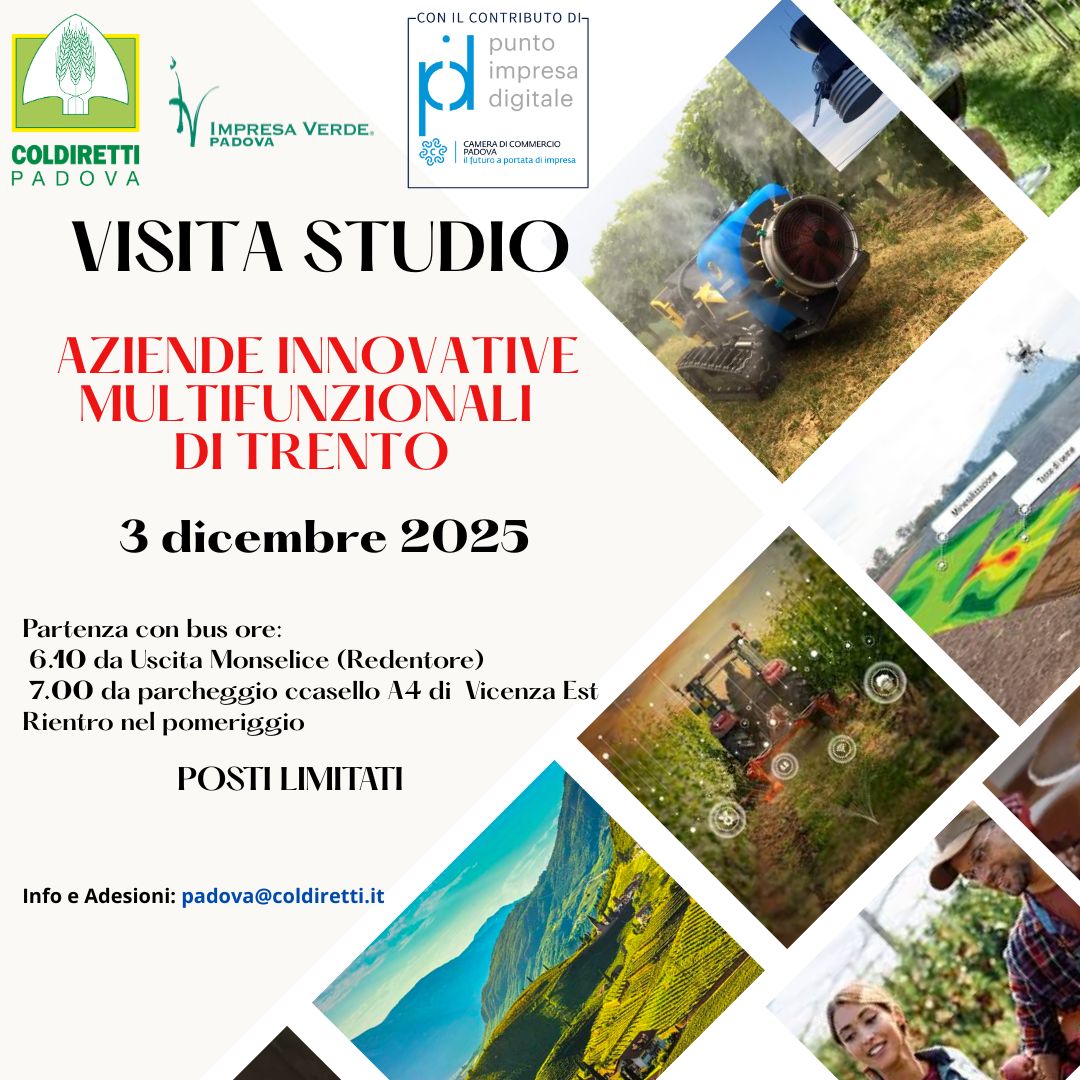 Coldiretti Padova e Impresa Verde Padova organizzano una visita studio a Trento, focalizzata sulle Aziende innovative multifunzionali. L’iniziativa rientra nell’ambito del progetto PID (Punto Impresa Digitale) della Camera di Commercio di Padova. L’appuntamento è fissato per mercoledì 3 dicembre 2025. La partenza è prevista in bus con i seguenti orari e punti di ritrovo: