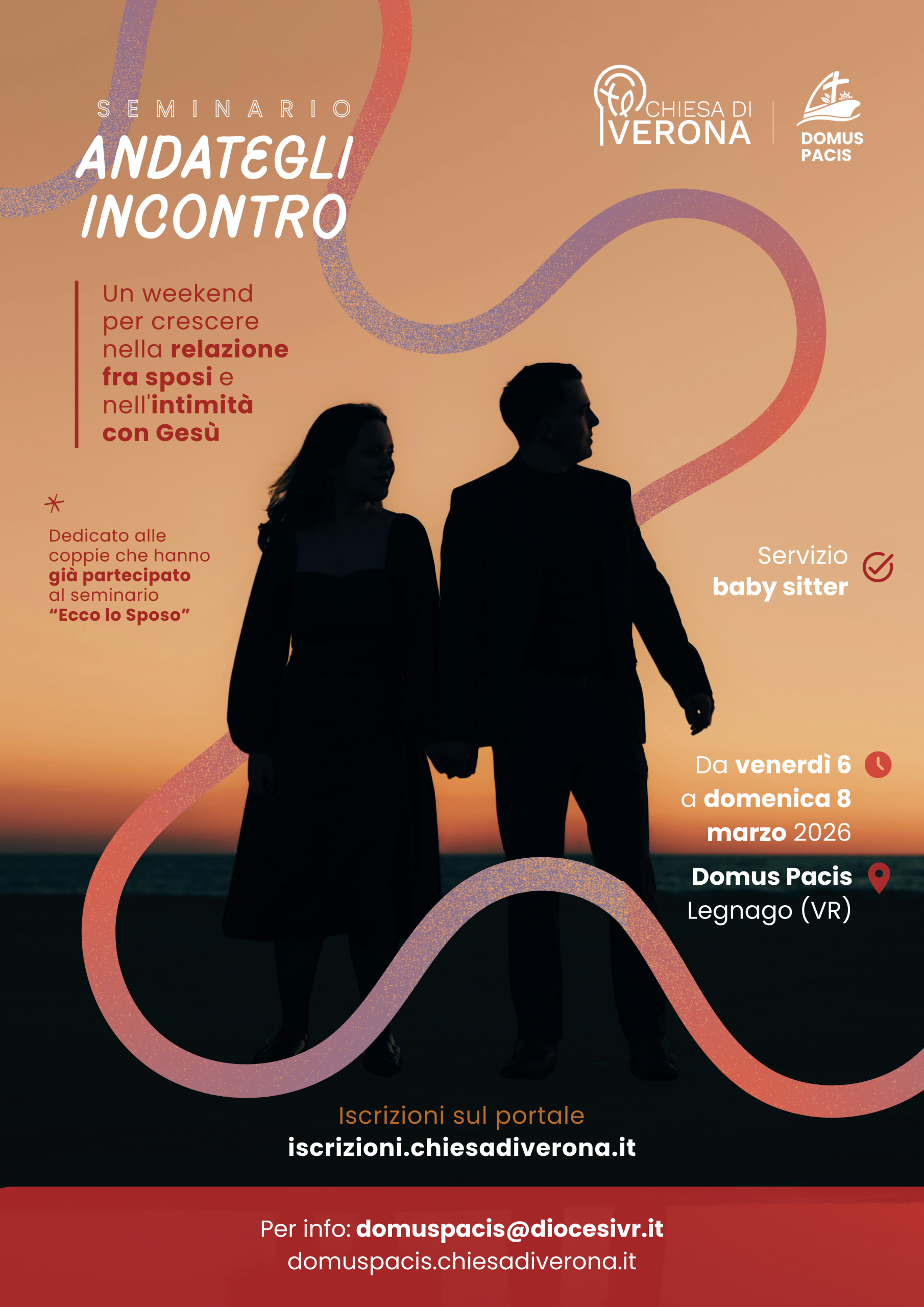 Il Centro diocesano Domus Pacis di Legnago propone il seminario “Andategli incontro“, dedicato alle coppie che hanno già partecipato al corso “Ecco lo Sposo”. Attraverso momenti di ascolto e di preghiera, gli sposi saranno accompagnati a scoprire come far crescere il loro rapporto con Gesù.