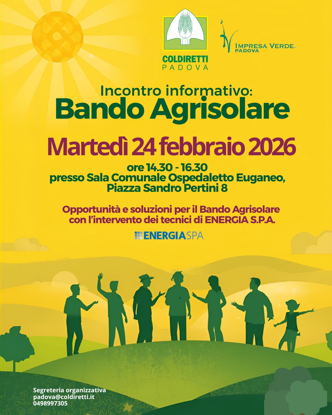Il settore agricolo guarda sempre più con interesse alle fonti rinnovabili e all’efficienza energetica. Per fornire risposte concrete e aggiornamenti tecnici sulle opportunità offerte dal Bando Agrisolare, Coldiretti Padova e Impresa Verde Padova organizzano un incontro informativo dedicato a soci e aziende del territorio. L’appuntamento è fissato per martedì 24 febbraio 2026, dalle ore 14:30 alle ore 16:30, presso la Sala Comunale di Ospedaletto Euganeo (Piazza Sandro Pertini 8).