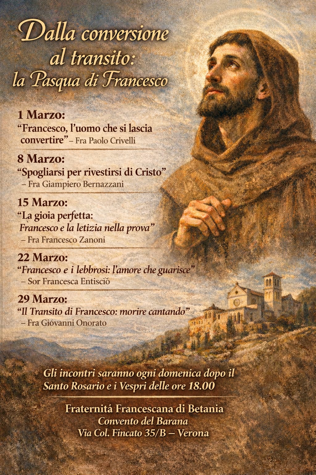 La Fraternità francescana di Betania invita al percorso Dalla conversione al transito: la Pasqua di Francesco, una serie di incontri domenicali che accompagnerà i fedeli nel cammino del Giubileo francescano indetto da Papa Leone XIV nell’ottavo centenario dalla morte del Santo di Assisi.