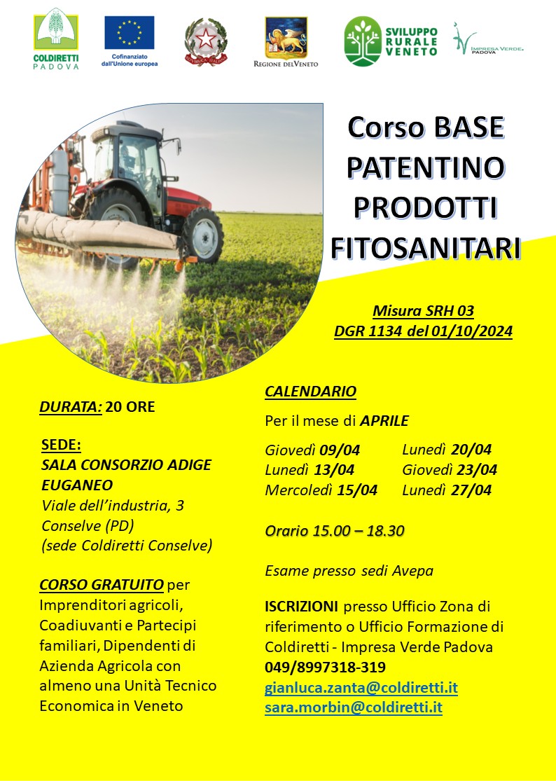 Impresa Verde Padova informa che sono aperte le iscrizioni per il corso BASE per il Patentino Fitosanitario (Acquisto), in programma per il mese di aprile presso la sede di Conselve. L’attività è interamente finanziata dal CSR Veneto 2023/2027 (DGR 1134 del 01.10.2024) ed è quindi gratuita per titolari, coadiuvanti, partecipi familiari e dipendenti di aziende agricole con unità tecnico-economica in Veneto.