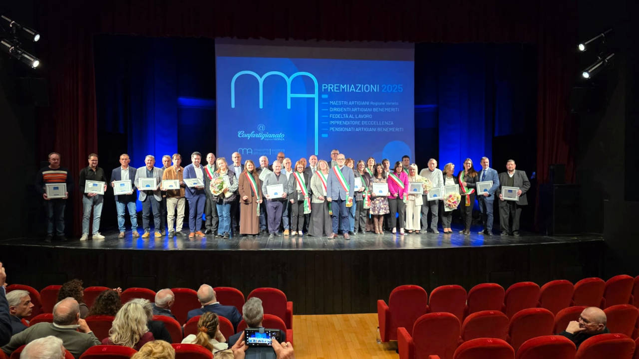 Un plauso particolare è andato ai dodici Maestri Artigiani della Regione Veneto vicentini del 2025. Un riconoscimento che premia percorsi umani e professionali che contribuiscono, non solo alla crescita economica del territorio, ma anche alla salvaguardia di lavorazioni nel solco della tradizione o con una loro rilettura in chiave innovativa, e alla trasmissione del saper fare artigiano ai giovani. Per i dodici soci di Confartigianato quindi il riconoscimento, espressione di un progetto in cui l’Associazione ha da sempre creduto in quanto fondato sull’esperienza vissuta, rappresenta una tappa che riconosce il valore del lavoro, della tenacia, del farsi esempio per le giovani generazioni.
